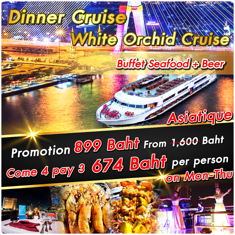 White Orchid River Cruise 3-Deck Rooftop (Asiatique)Mon-Thu ฿899 (4 pay 3 - ฿674) / Fri-Sun ฿899