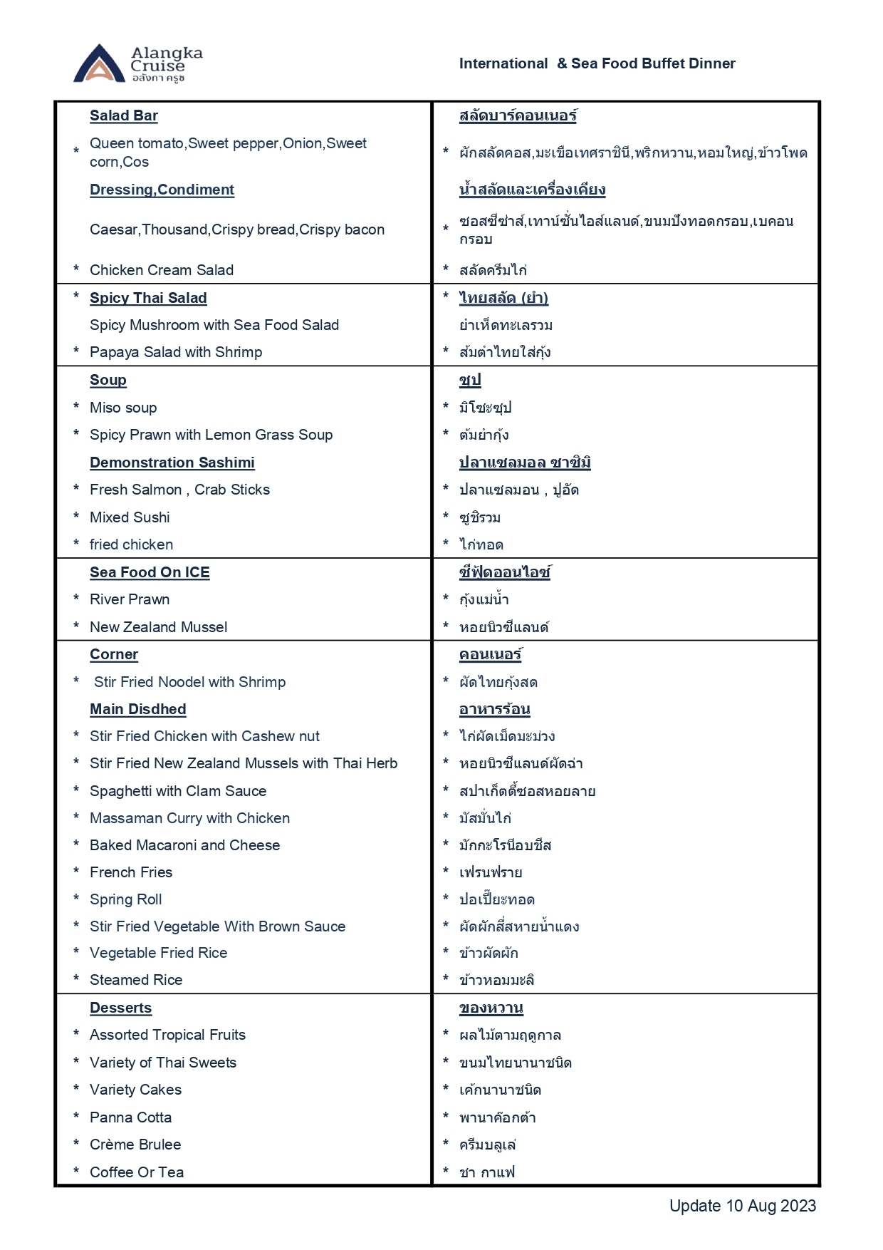 Cruise dinning with traditional Thai and international buffet. Alangka Cruise will bring you along the Chao Phraya river.
