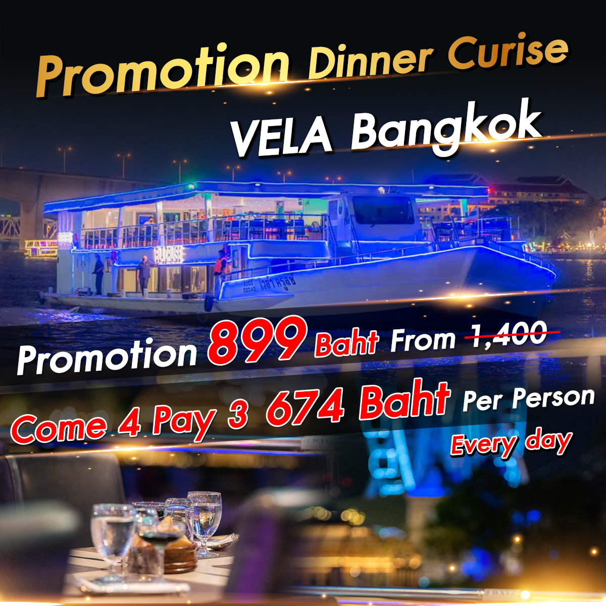 A Romantic Dinner Cruise along the Chao Phraya River with International Buffet and Live Music. Surrounded by a Picturesque View of the Chao Phraya River at nighttime while enjoying a Quality Thai and International Buffet. Come to create a memorable night with your loved ones on Vela Cruise. The ship operates daily from Asiatique The Riverfront.