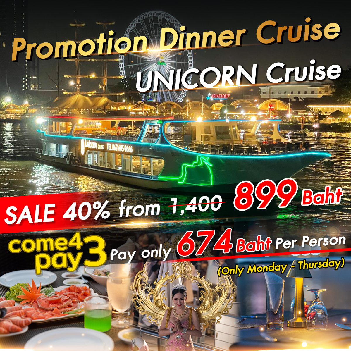 Book a dinner cruiseUnicorn Cruise counter at Pier 4, Floor G, ICONSIAM