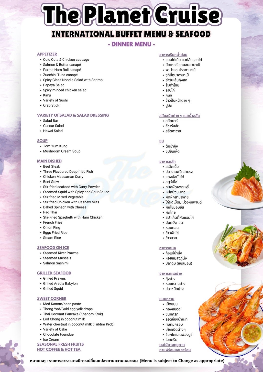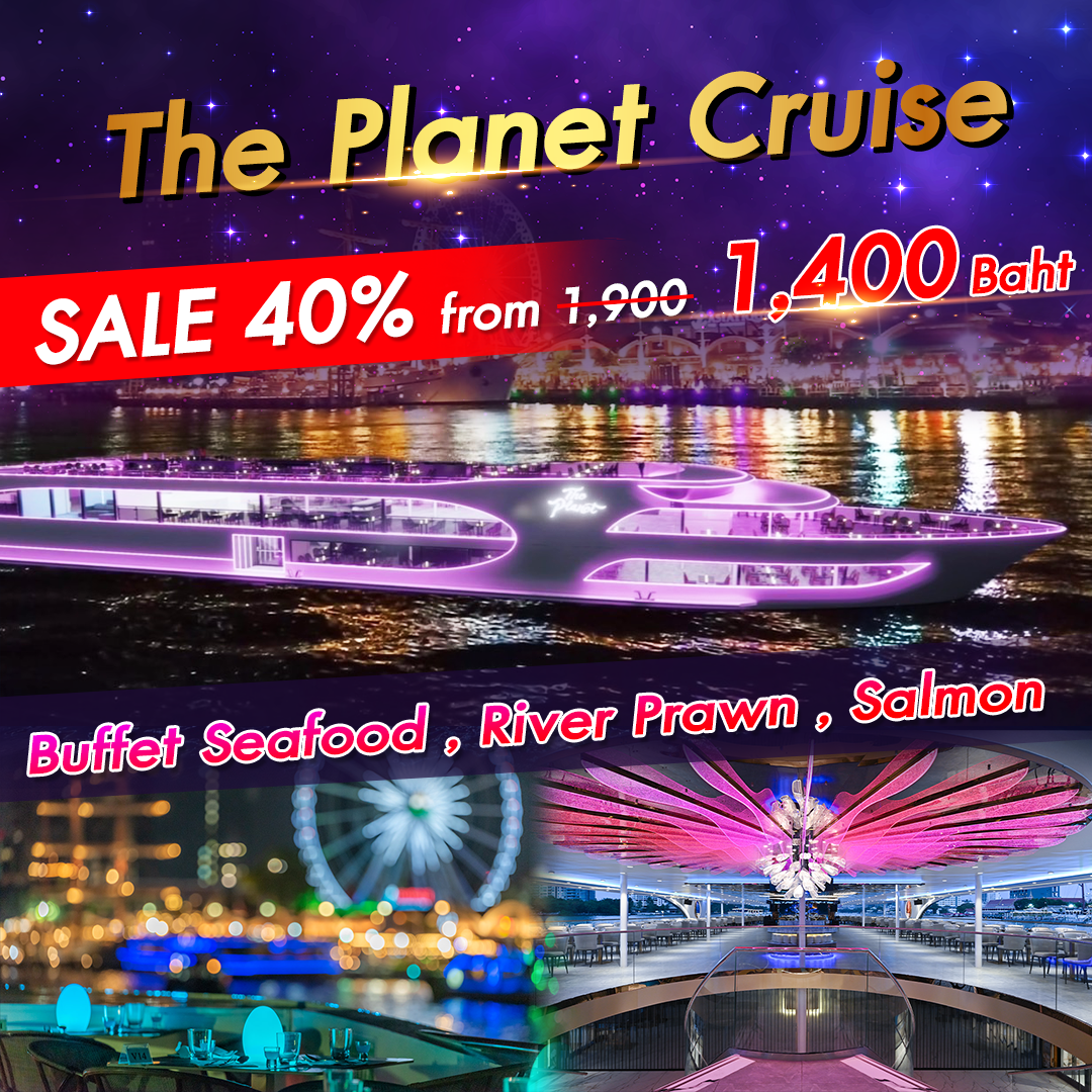 Cruise along Chao Phraya River with The Planet Cruise Surrounded by romantic atmosphere of Bangkok night while having international buffet. Entertained by live music and traditional dance. Come to create a memorable night with your loved ones.